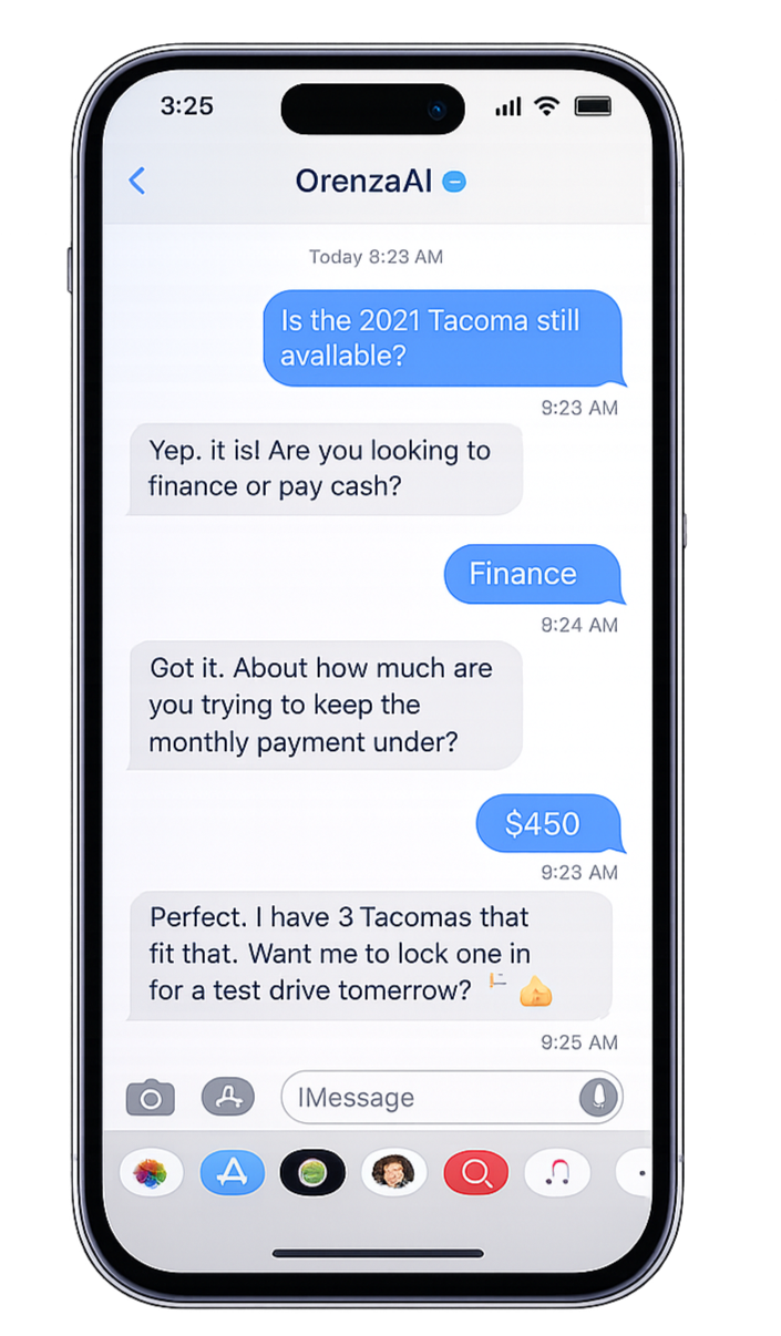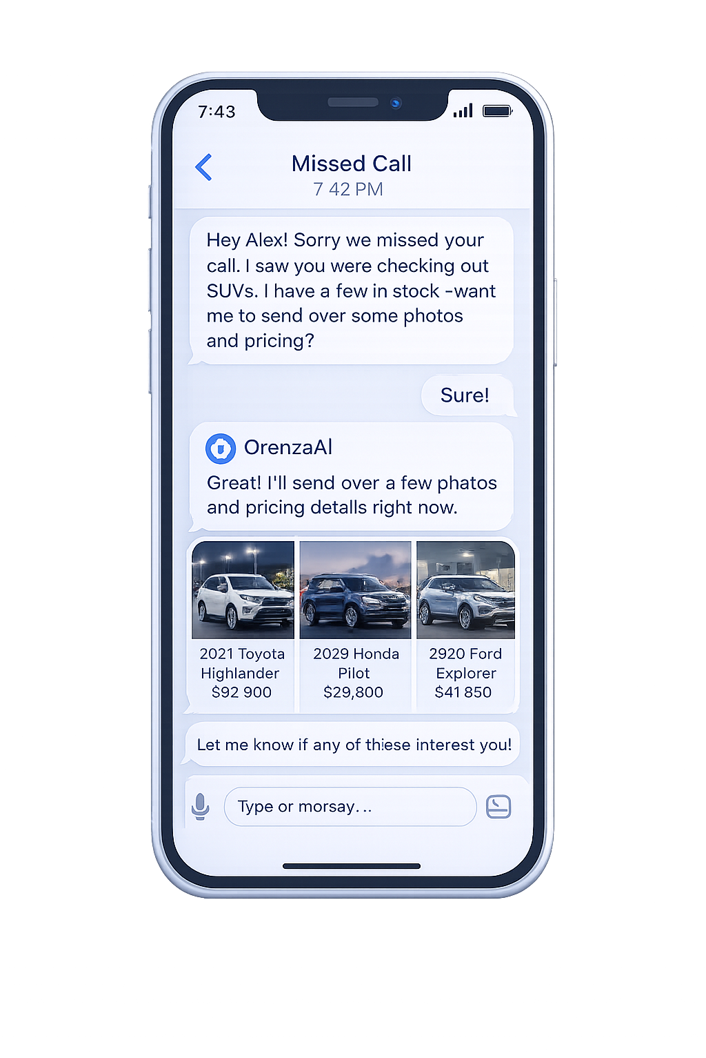 1. Lead comes in (form or missed call)2. OrenzaAI starts a real text conversation instantly3. It answers vehicle-specific questions in real time using live inventory data4. It matches buyer intent to live inventory automatically5. It qualifies budget, timing, and urgency6. Serious buyers are flagged automatically7. Sales steps in with full context