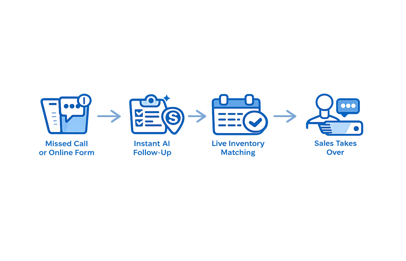 - Identifies buyer intent in real time- Qualifies budget, financing, and urgency- Routes hot leads directly to sales